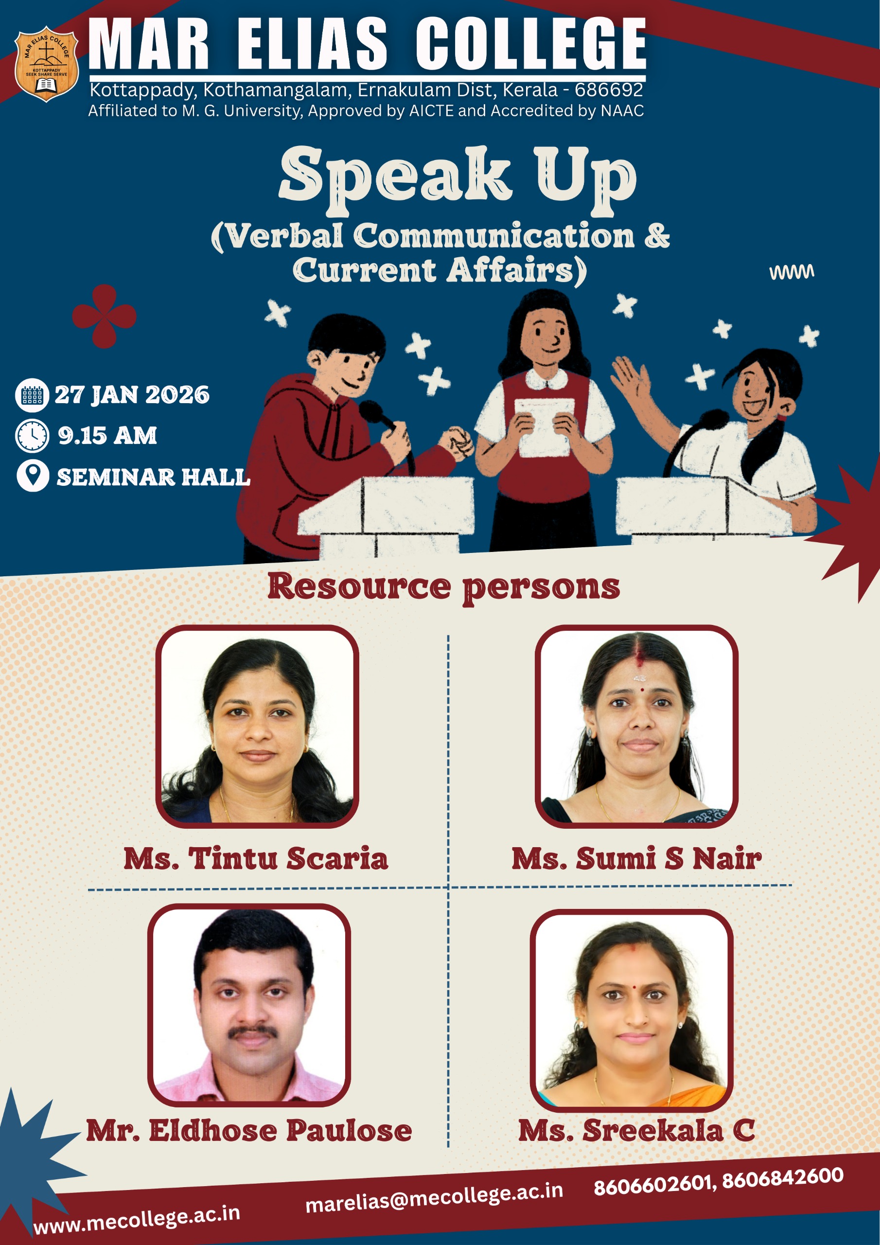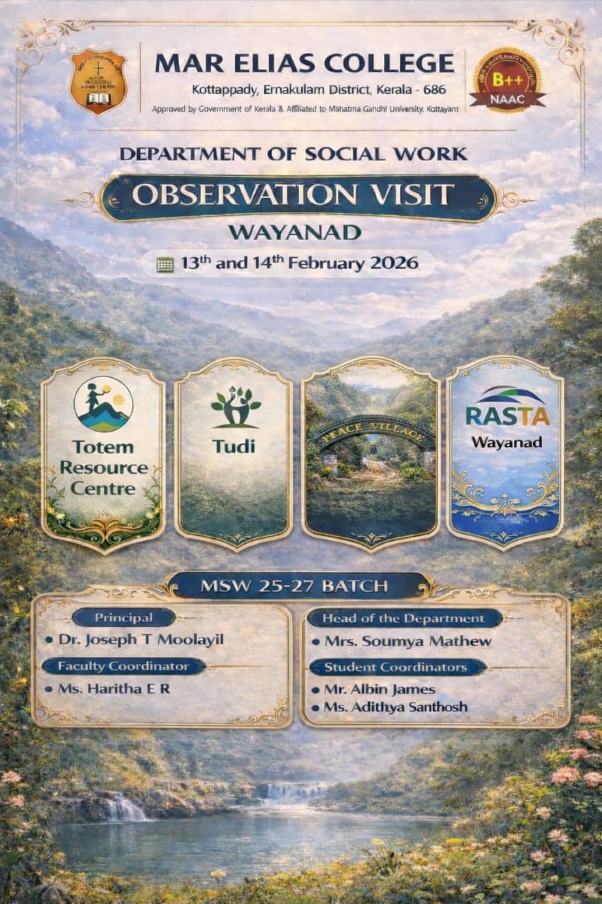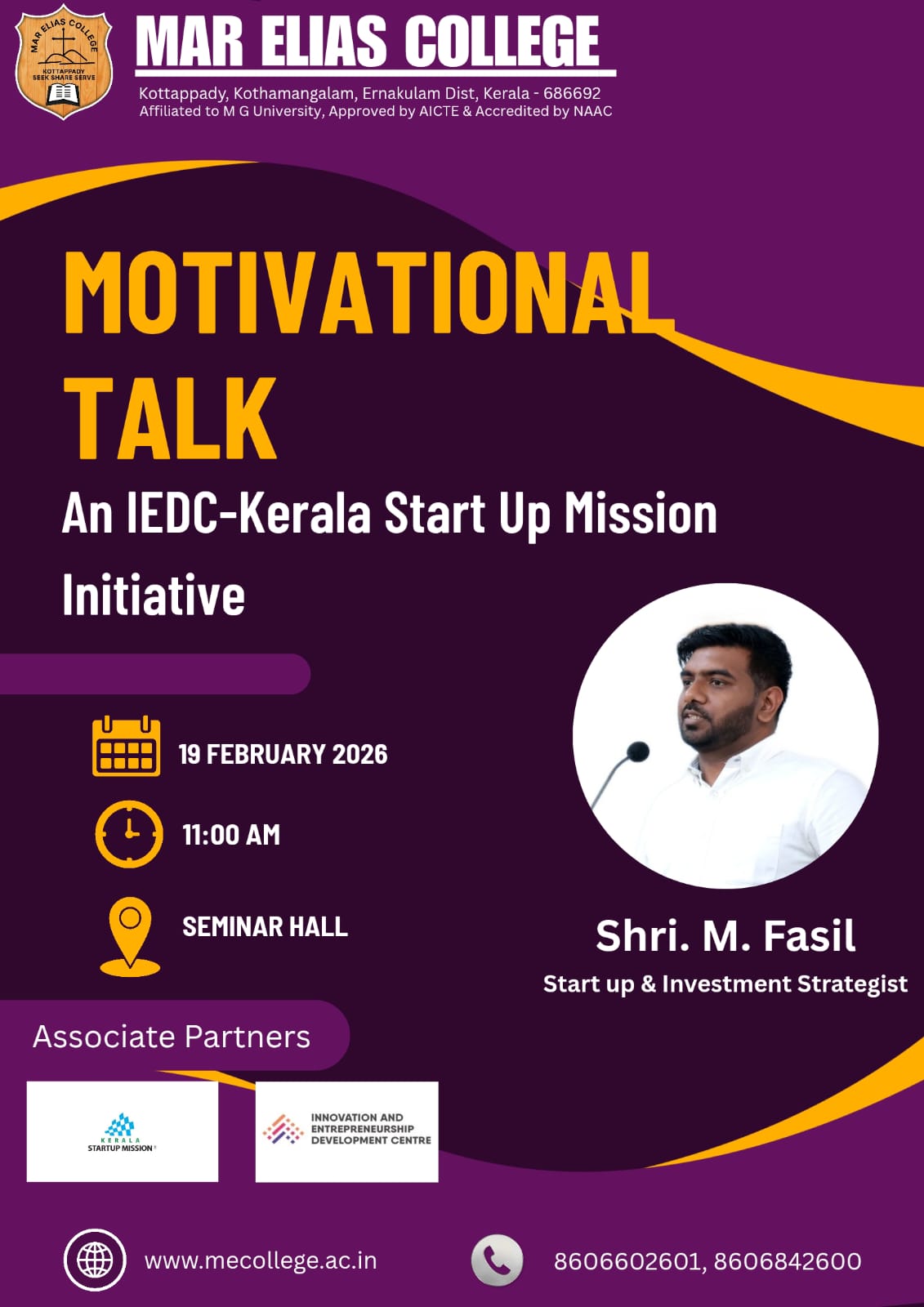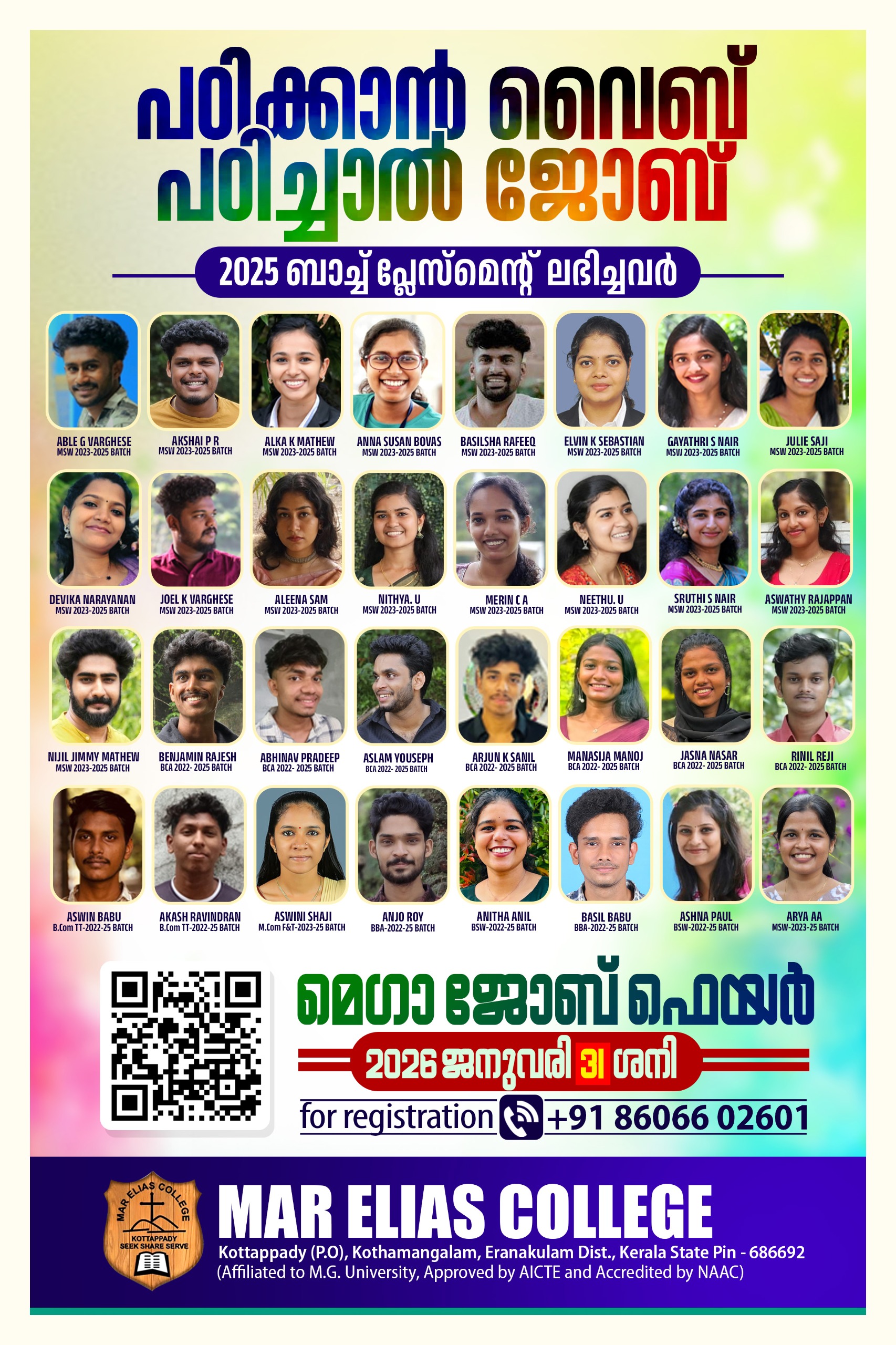 Welcome to Mar Elias College Kottapady where we are committed to foster academic excellence, innovation and personal growth. At Mar Elias College, we believe in the transformative power of education to shape the future and empower individuals to achieve their fullest potential.