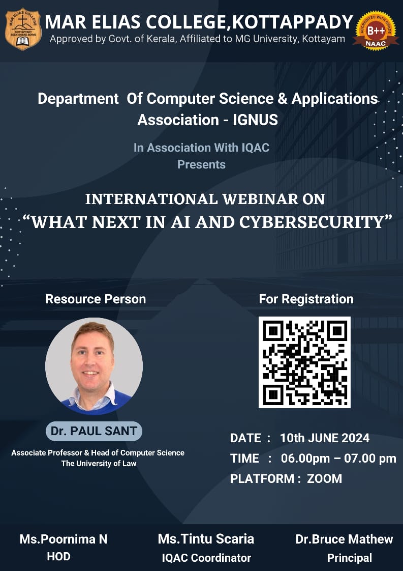 Department of Computer Science & Applications Association (IGNUS)in association with IQAC presents International Webinar on "What Next in AI and Cybersecurity" o 10 June 2024.