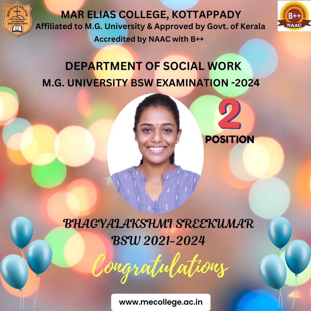 Ms.BHAGYALAKSHMI SREEKUMAR of BSW (2021-2024) secured 2nd position in M G University BSW Examination - 2024
