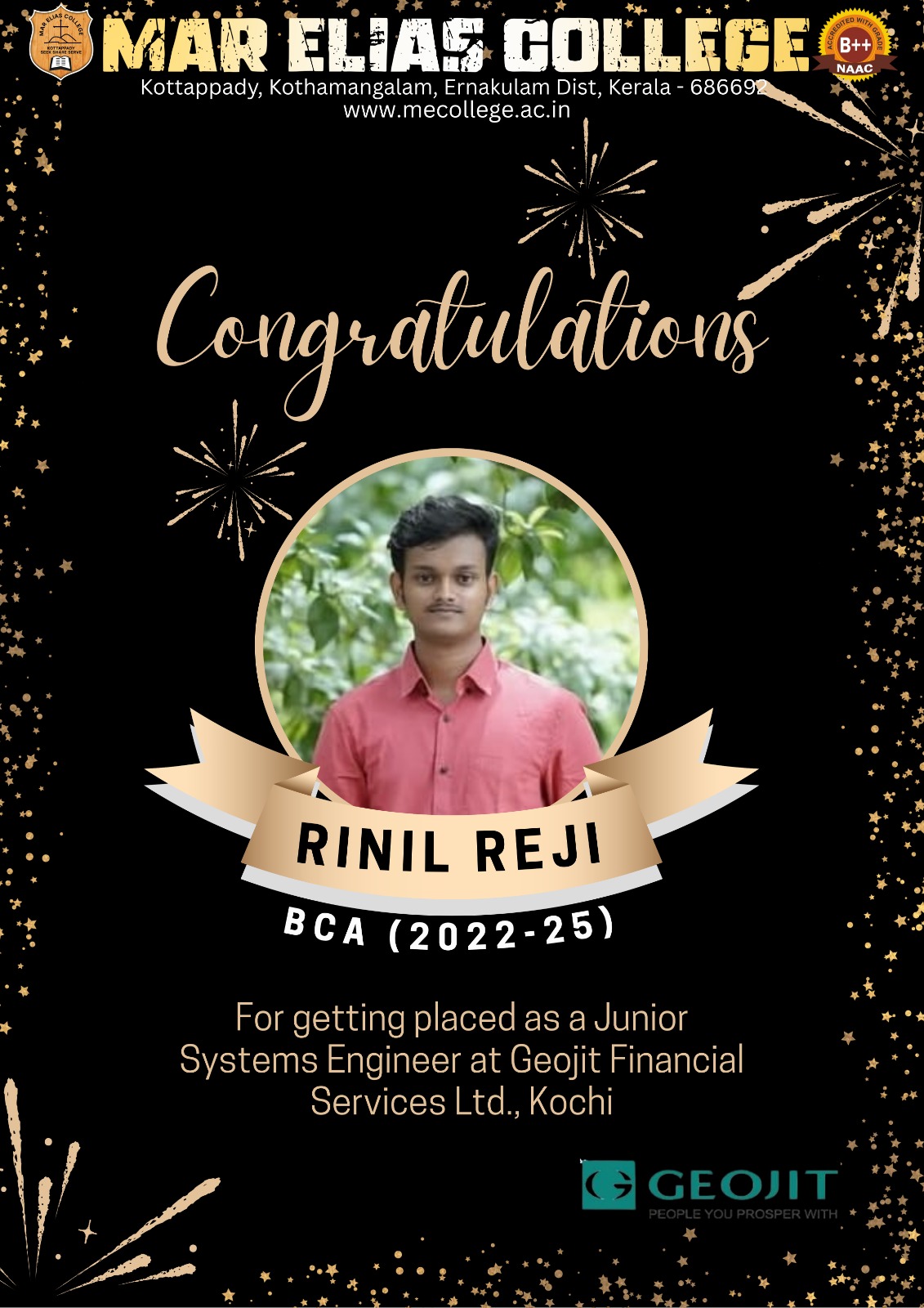Placed as Junior Systems Engineer at Geojit Financial Services Ltd. Kochi