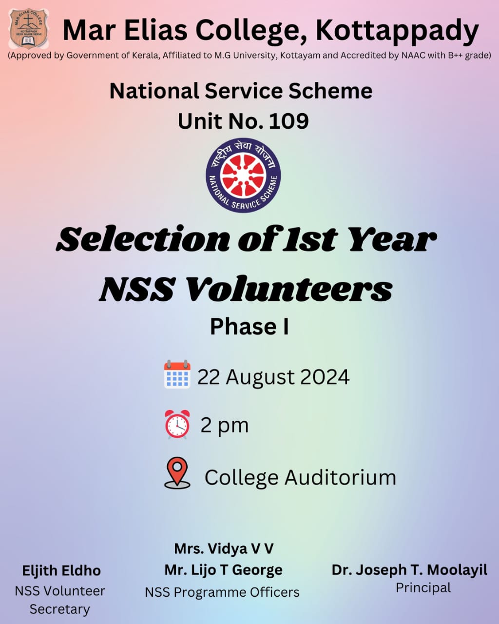 Selection of 1st year NSS volunteers - Phase 1 on 22 August2024 at College Auditorium