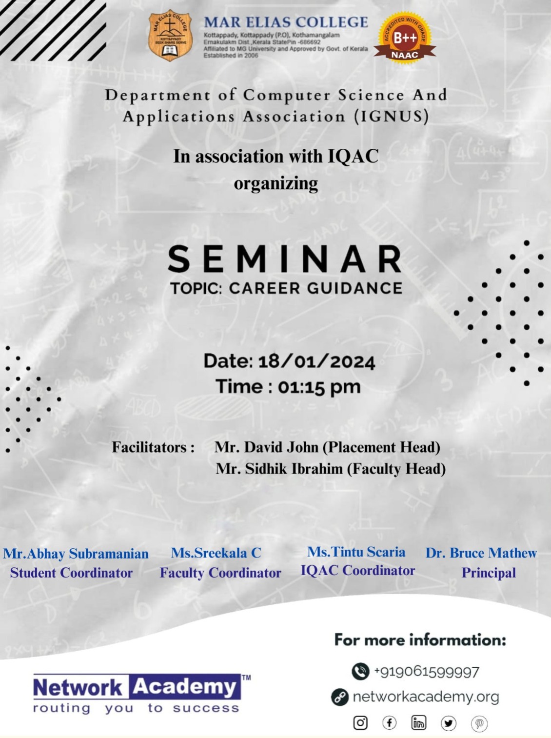 Deapartment of Computer Science and Applications Association (IGNUS) in association with IQAC is organising a Seminar on Career Guidance by Network Academy.
