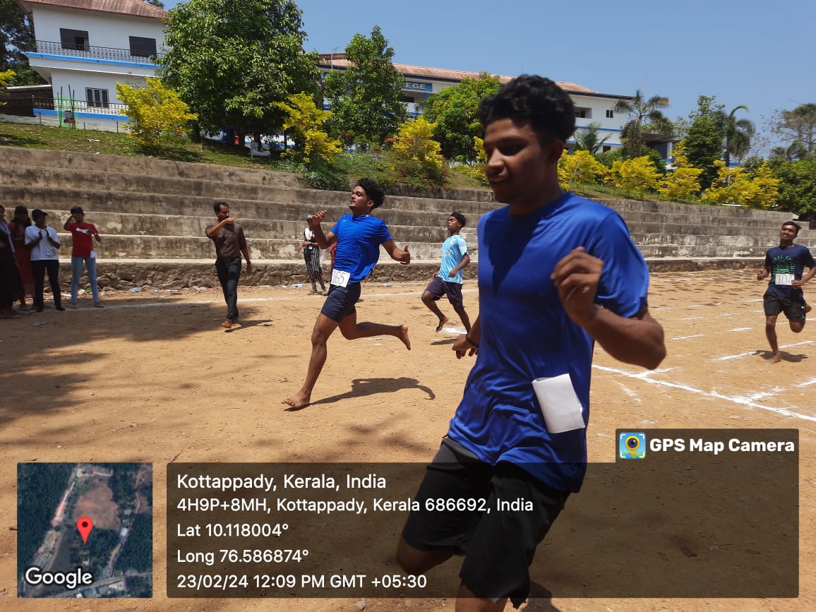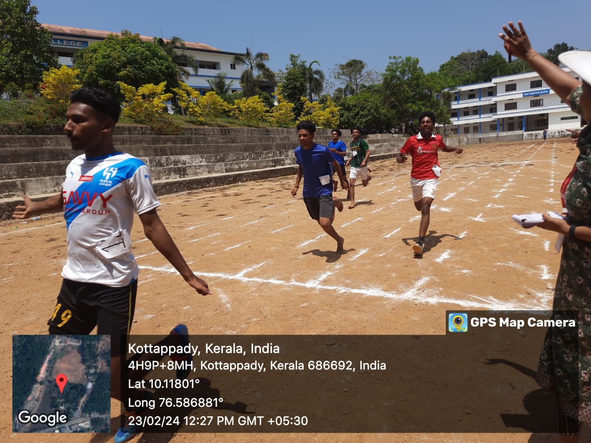 Various series of races such as 100, 200, 400, 800, 1500, 3000 meters races, 4*100 meters relay for boys & girls, and 4*400 meters relay for girls & boys, along with discus throw for girls, were conducted on 23/2/2024 from 9 am onwards. All sports programs concluded by 1 pm. Individual champions of Annual Sports 2023-24 are Muhammed Miras, Sruthin P Murali, Deepak M A, and Jeemol George. Prizes for winners were distributed on 14/3/2024 during college day celebrations.