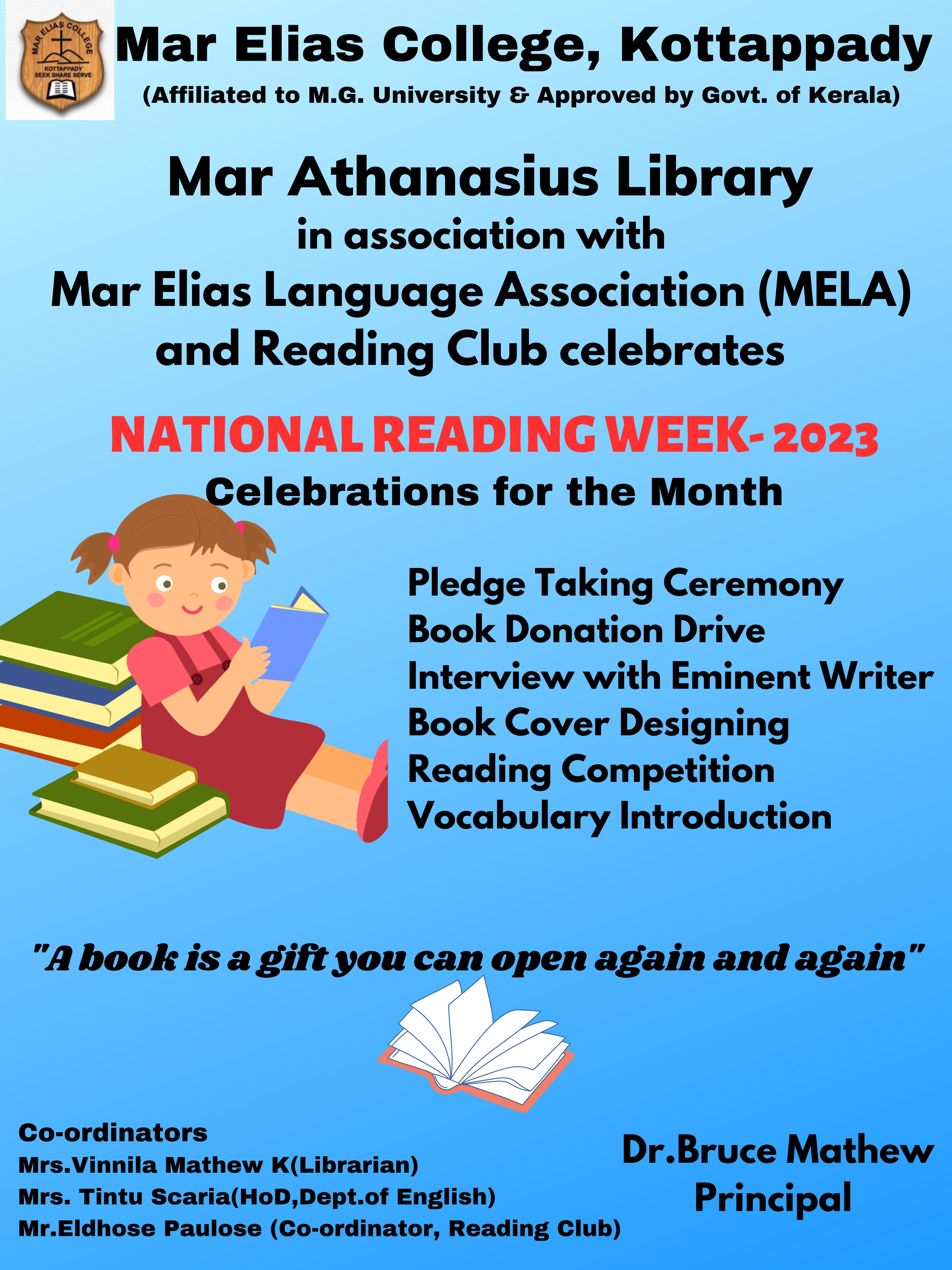 Reading club of Mar Elias College is an inclusive group of teachers and students for promoting reading. Club reviews books of notable authors in various languages. Club recommends the important books to the library.